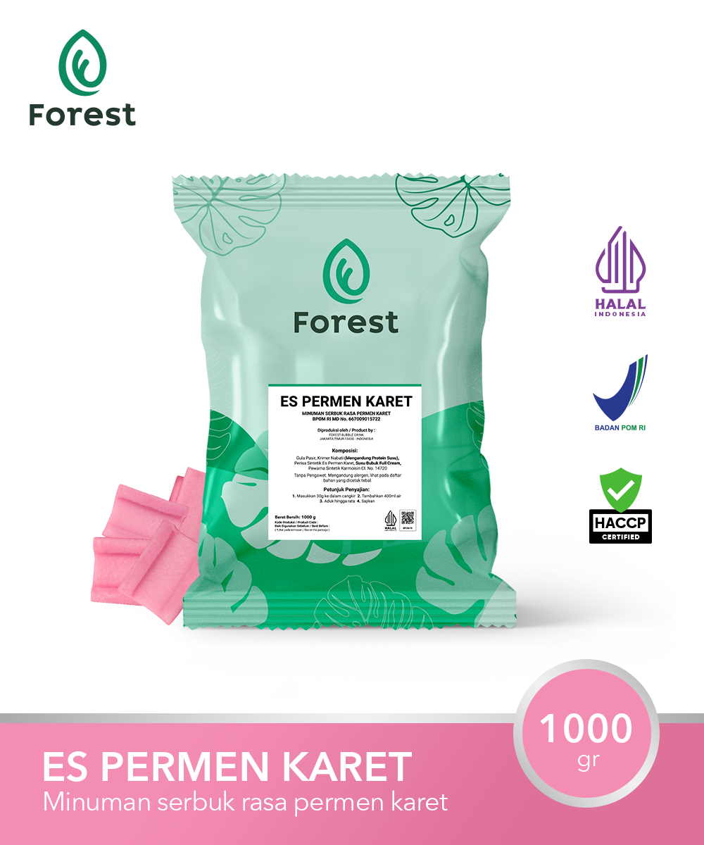 Es Permen Karet Powder - Bubuk Minuman Bubble Drink rasa Es Permen Karet. Bubuk minuman FOREST Beverage Solutions ( Bubble Drink ) berkualitas tinggi. Berat bersih 1000 gram. Isi: Non dairy creamer, flavour, dan TANPA GULA. Sehingga dengan jumlah gramasi yang sama, bubuk minuman produk kami menghasilkan minuman yang lebih kaya, lebih bold, lebih creamy, dan pastinya lebih nikmat.