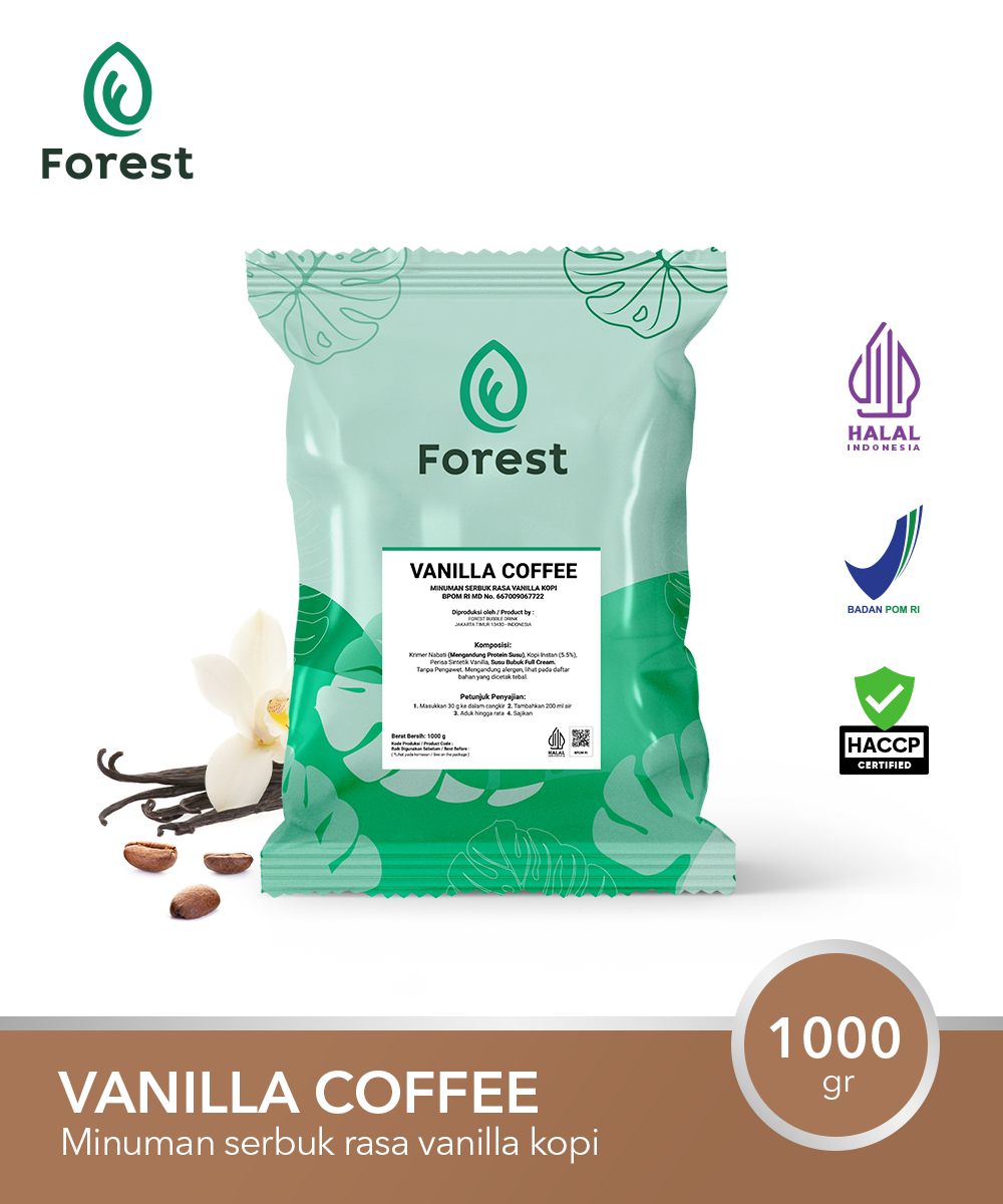 Vanilla Coffee Powder - Bubuk Minuman Bubble Drink rasa Vanilla Coffee. Bubuk minuman FOREST Beverage Solutions ( Bubble Drink ) berkualitas tinggi. Berat bersih 1000 gram. Isi: Non dairy creamer, flavour, dan TANPA GULA. Sehingga dengan jumlah gramasi yang sama, bubuk minuman produk kami menghasilkan minuman yang lebih kaya, lebih bold, lebih creamy, dan pastinya lebih nikmat.